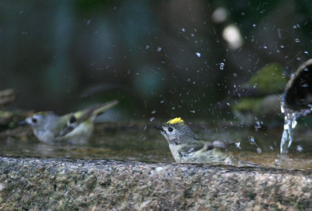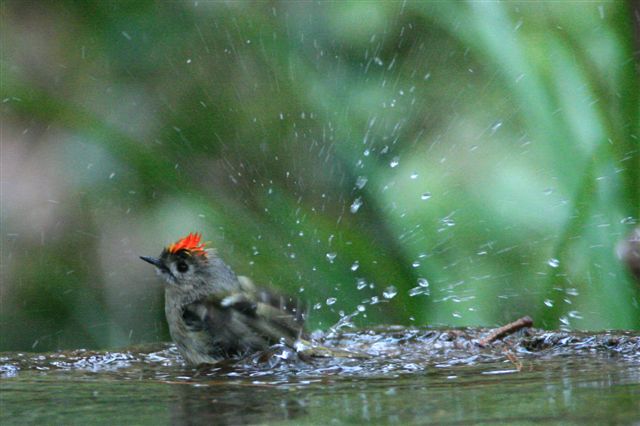 オスの水浴び 水浴びの中ごろ、冠羽が膨れ始めている 左ではメジロが水浴びをしている