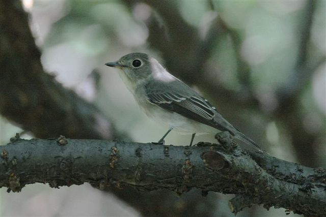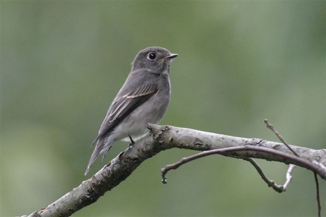 コサメ4 暗い木陰にて撮影、とても美しい鮫色です。風切羽の外縁が白い。サメビタキの外縁は茶褐色。エゾビタキは胸部に斑点がある。3者とも眼はとても大きい。(08/10/ 1 植物園)