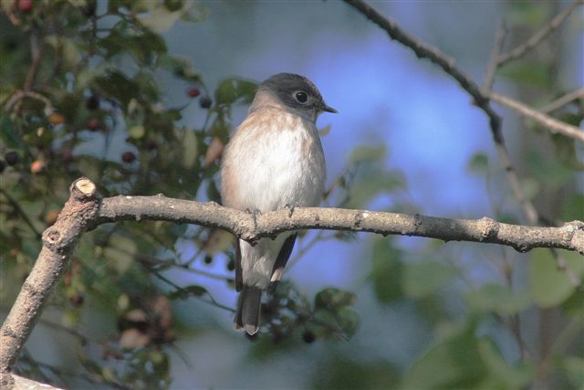 サメ2 木陰であるので、胸の斑がハッキリしていて、エゾビタキの斑と見間違えるほど。下尾筒の先端と翼の先端は尾羽の1/2に届き、なお翼と尾羽との間には隙間があり、翼はダラリとしている。嘴は幅広で短く感じられる。(08/ 9/24 植 物園)