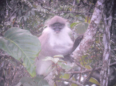 10:00  鳥を探しながら、歩いてゆくと、向かうから男性が走ってきます。ユーミンでした。「若いから、鍛錬のために走っているのだ」と思ったら、目の前でとまって、「Hornbillサイチョウがいた」といいました。聞くやいなや、私は突いていた杖の真ん中あたりをにぎりしめ、「そりゃたいへんだ」とたったったでなく、どさどさと駆け出しました。下りでしたから助かりました。といっても70米くらいでしょうか。右側が広く谷になって、視界が開けたところで、多分一緒に走ったユーミンが「あそこ、あそこ」といいました。