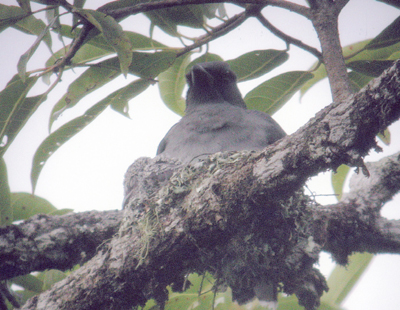 わかりません。望遠鏡でみると、赤いホーンがみられ、「2羽いる」といいましたが、アマチュアには1羽だけ。「足下に尾羽がみえる」そうかなあと思ってみていると、1羽が枝の先の方へいって、確かに2羽「暑いからあっちへいって」とでも言ったんでしょうかねえ」と言って笑いました。