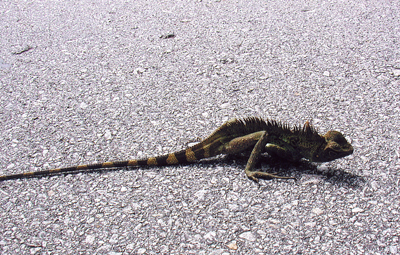写真を撮り終わって、道の真ん中にいるトカゲをユーミンがそっと靴で押しやると、何とあの長い後ろ足の膝をのばして、半分立った形で走り出しました。丁度踊っているみたいで、その格好が面白かったので、3人で笑って仕舞いました。