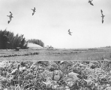 上部 巨椋池干拓地の「ケリ」 下部 同池にての蕃殖状況 高田俊雄撮影 |